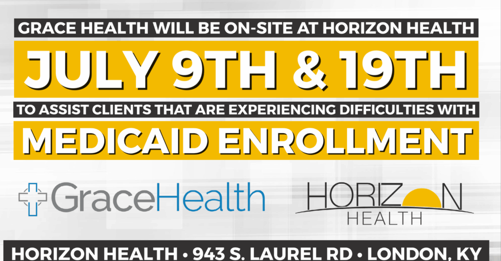 Grace Health will be on-site at Horizon Health in London on July 9th and 19th to assist clients that are experiencing difficulties enrolling in Medicaid. For more information, please contact Michael Wynn, Outreach/Enrollment Specialist at Grace Health via email at mike.wynn@gracehealthky.org or call (606) 515-8843.